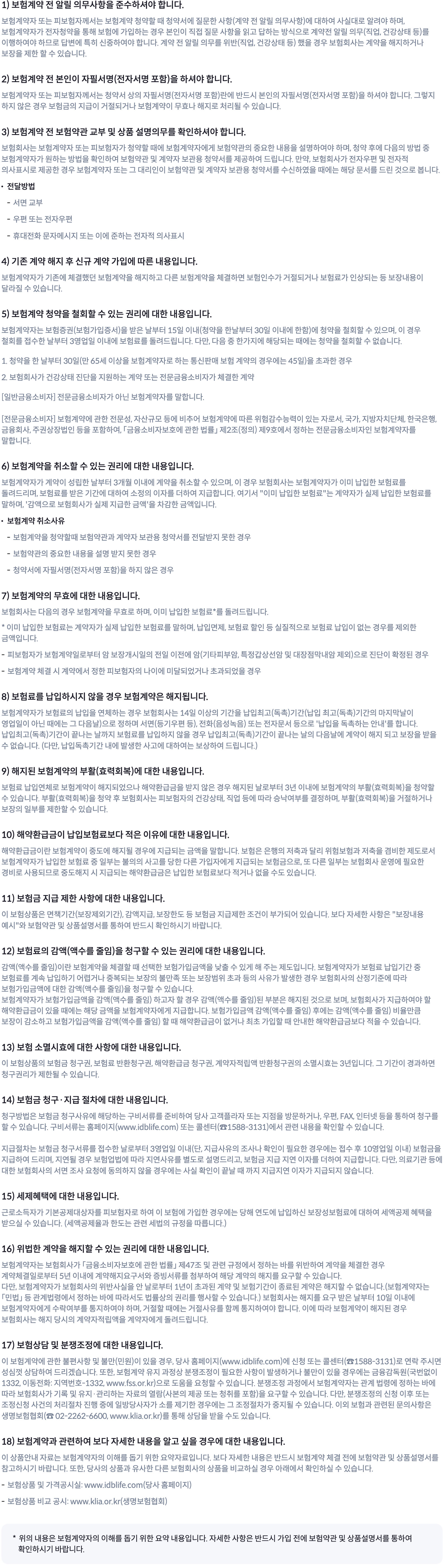 이 상품안내 사항을 이해하지 못하고 보험에 가입할 경우 불이익을 받을 수 있으므로, 해당 내용을 반드시 이해하시고 계약체결 여부를 결정하시기 바랍니다.